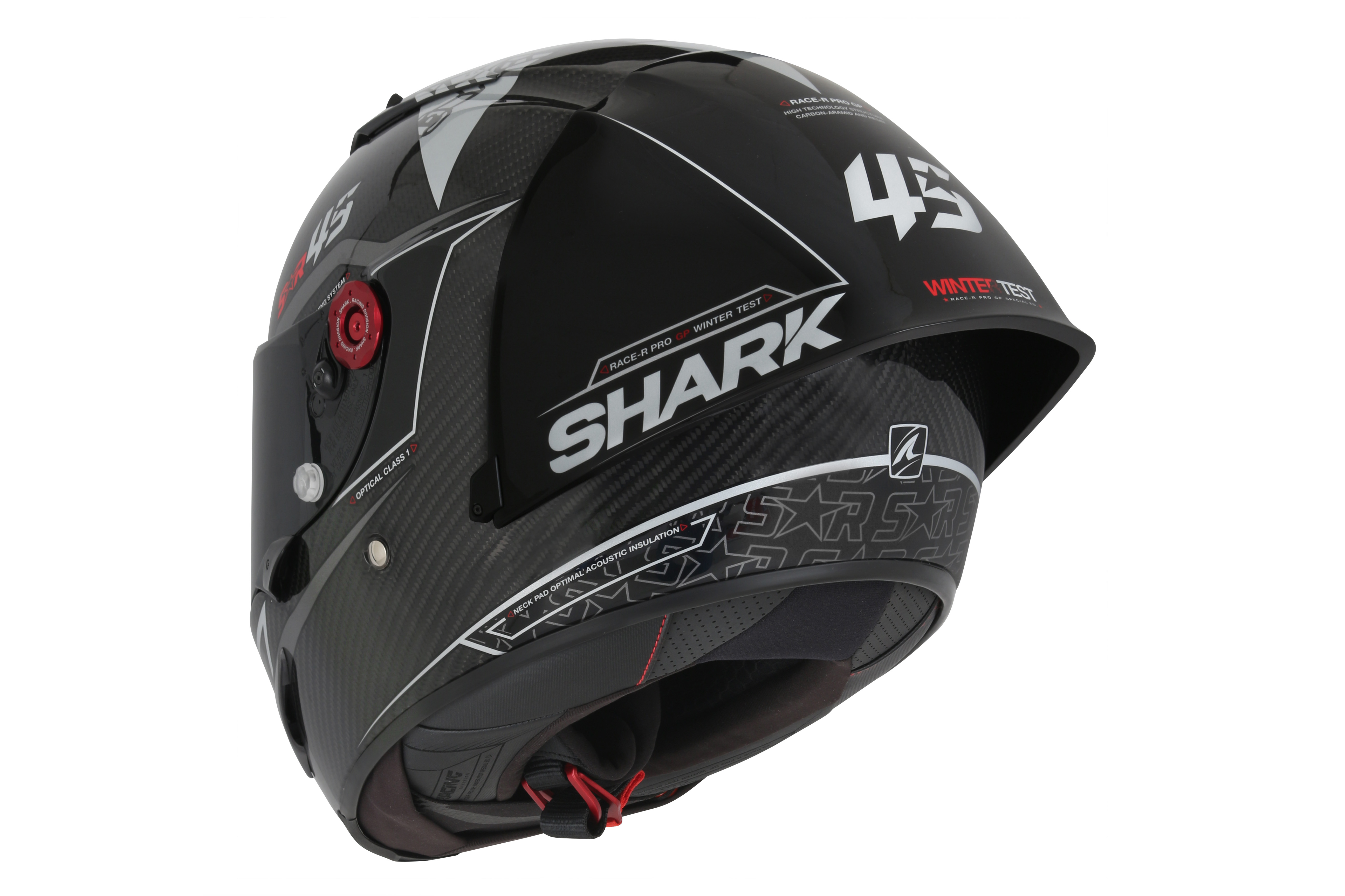 The Race-R Pro GP has been fitted with an aerodynamic spoiler designed specifically for racing. The high-performance profile has been developed through close collaboration between SHARK’s Research & Development teams and MotoGP racers as well as state-of-the-art testing based on Computational Fluid Dynamics (CFD). The ‘Quick Spoiler Safety System’ ejects the spoiler in the event of a fall to limit the effects of secondary shocks.