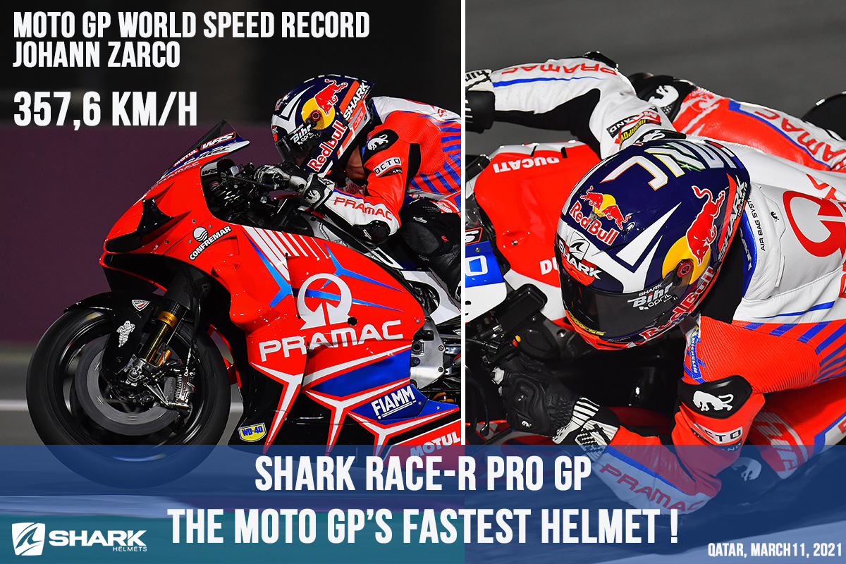 Wearing the emblematic helmet of the Racing SHARK line, the Race-R PRO GP, Johann Zarco becomes the fastest rider in the world in MotoGP with a speed record of 357.6 km/h on the Losail circuit of Qatar!