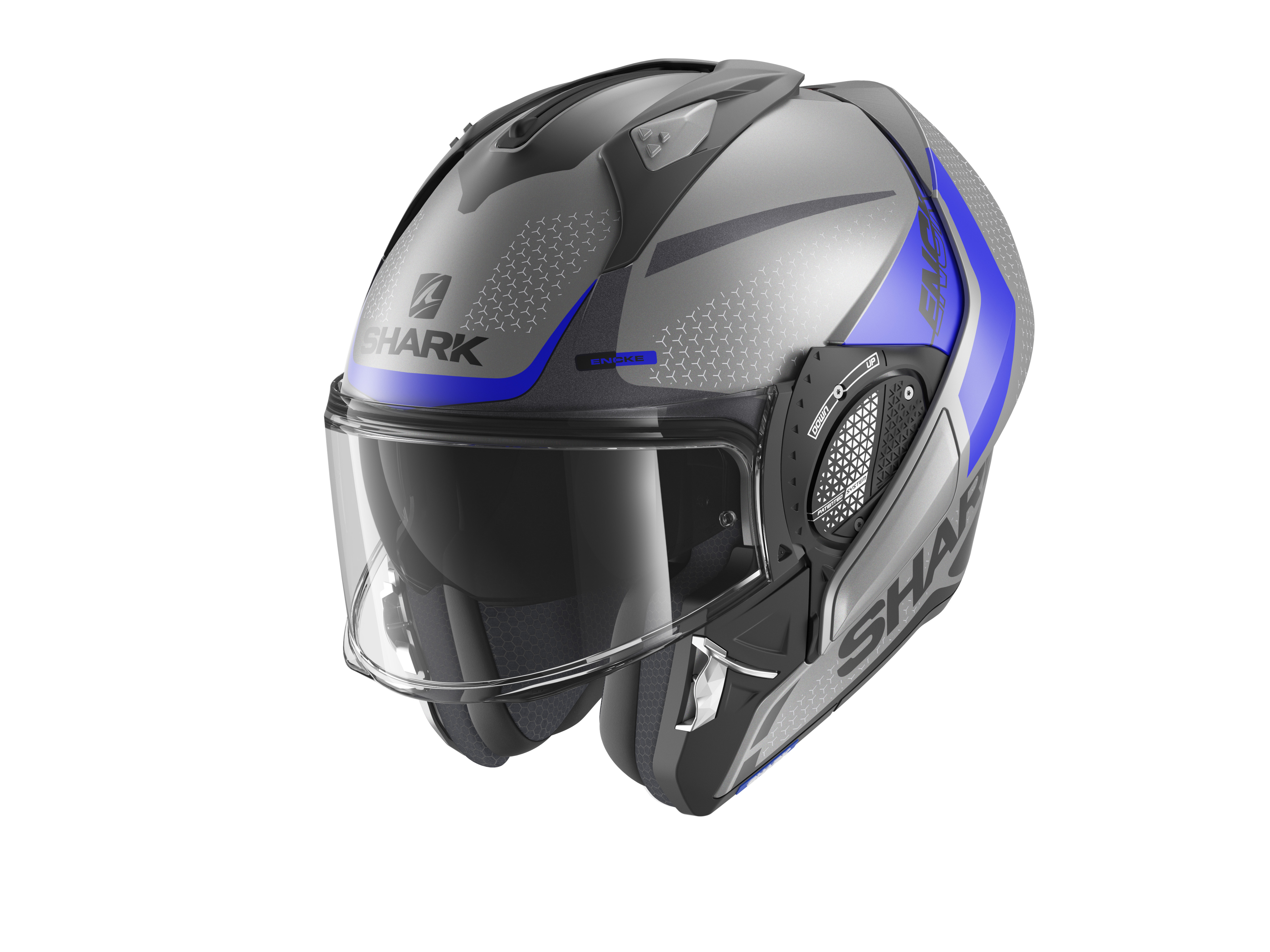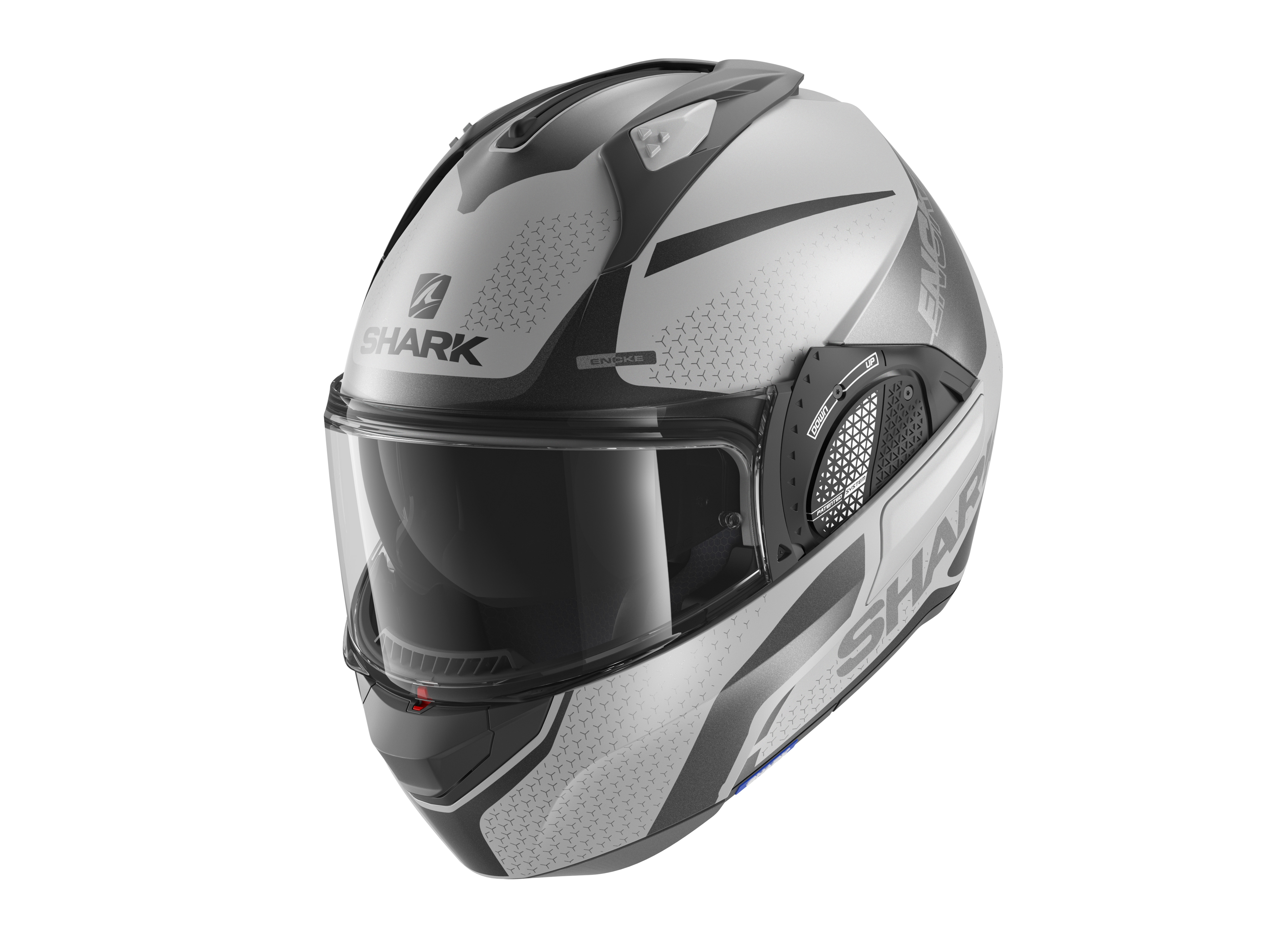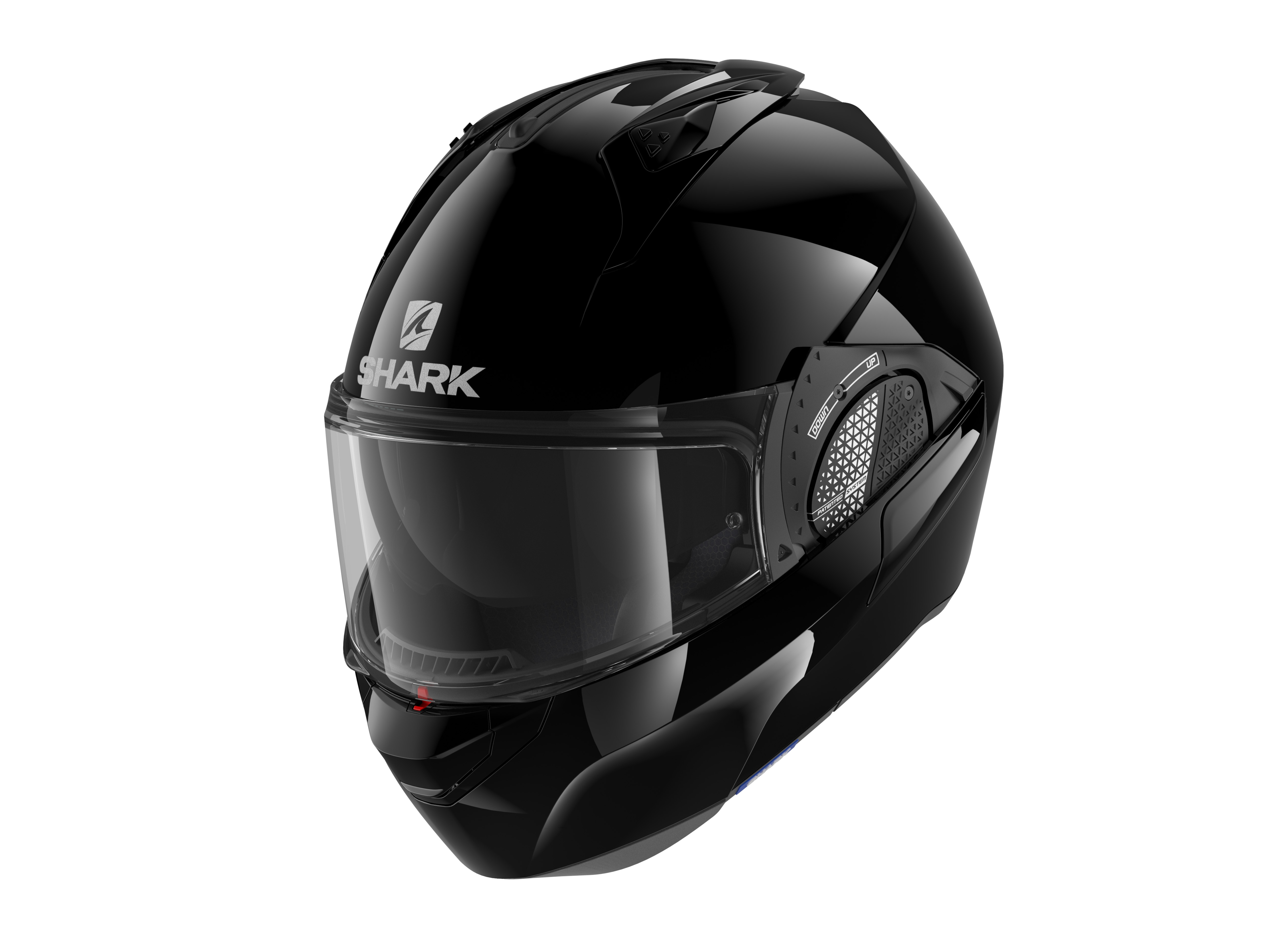 The patented SHARK Auto-up/Auto-down system makes it possible to automatically raise the visor when holding the chin guard. The new V-TECH system offers increased ergonomics and comfort of use with one-handed chin guard locking.