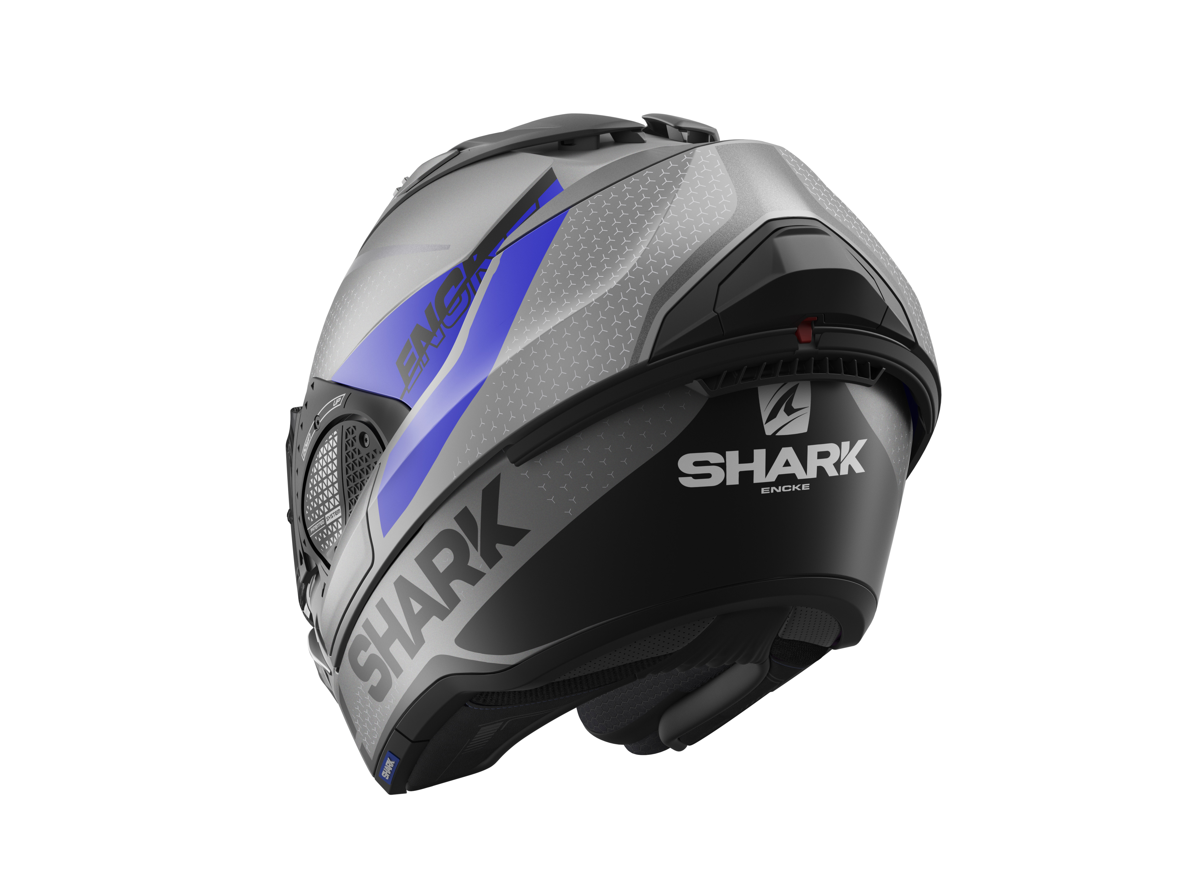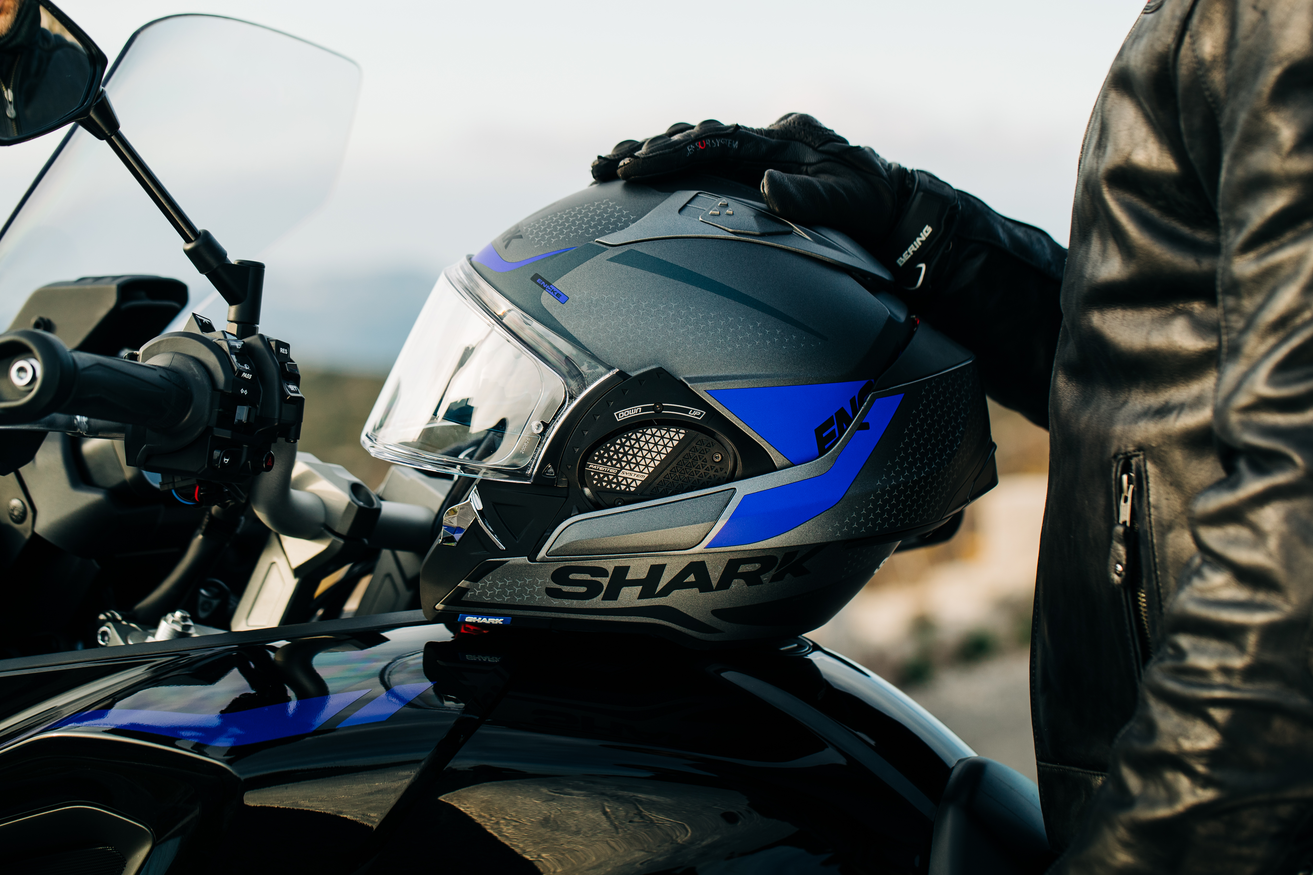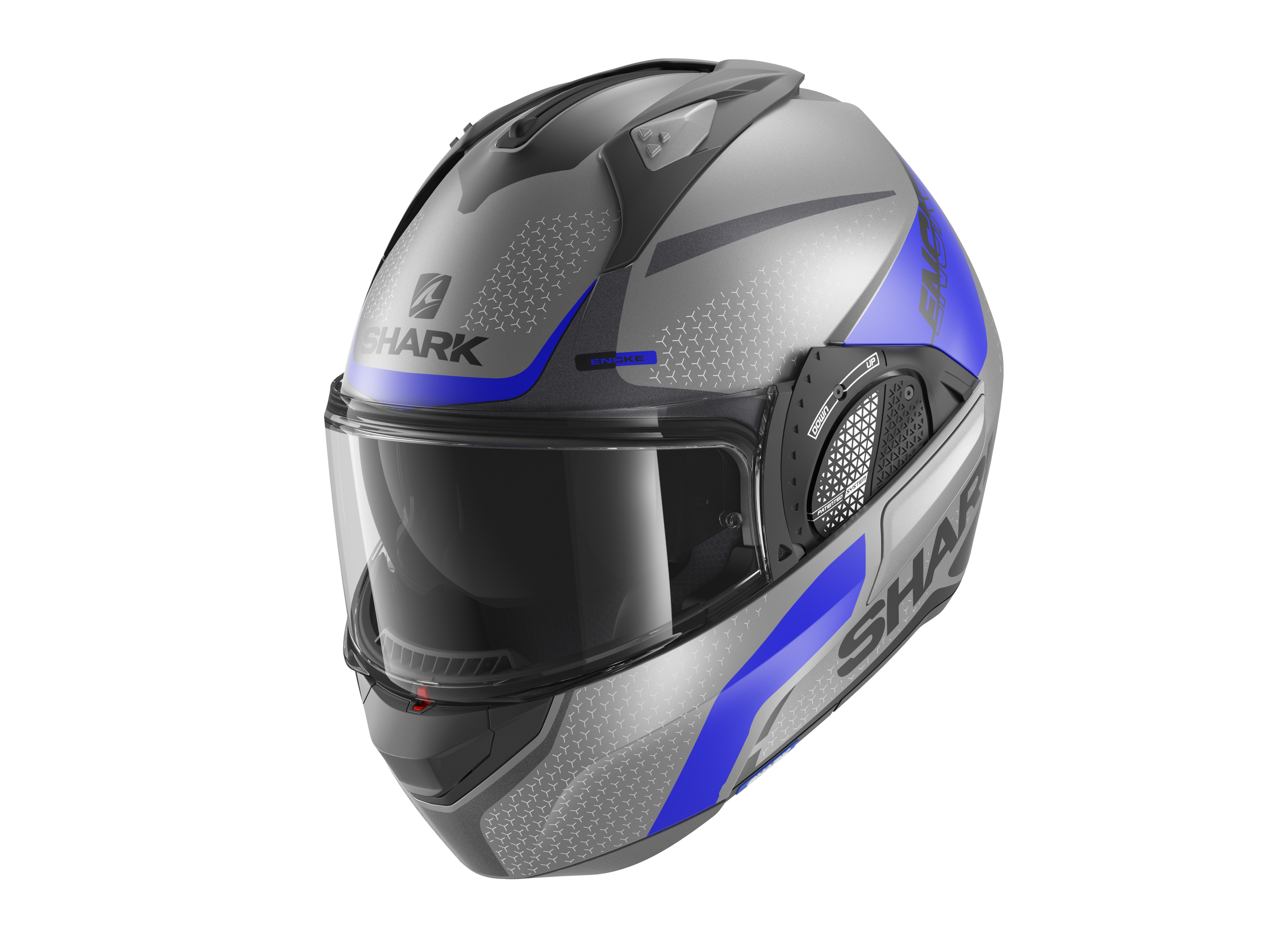 The patented SHARK Auto-up/Auto-down system makes it possible to automatically raise the visor when holding the chin guard. The new V-TECH system offers increased ergonomics and comfort of use with one-handed chin guard locking.