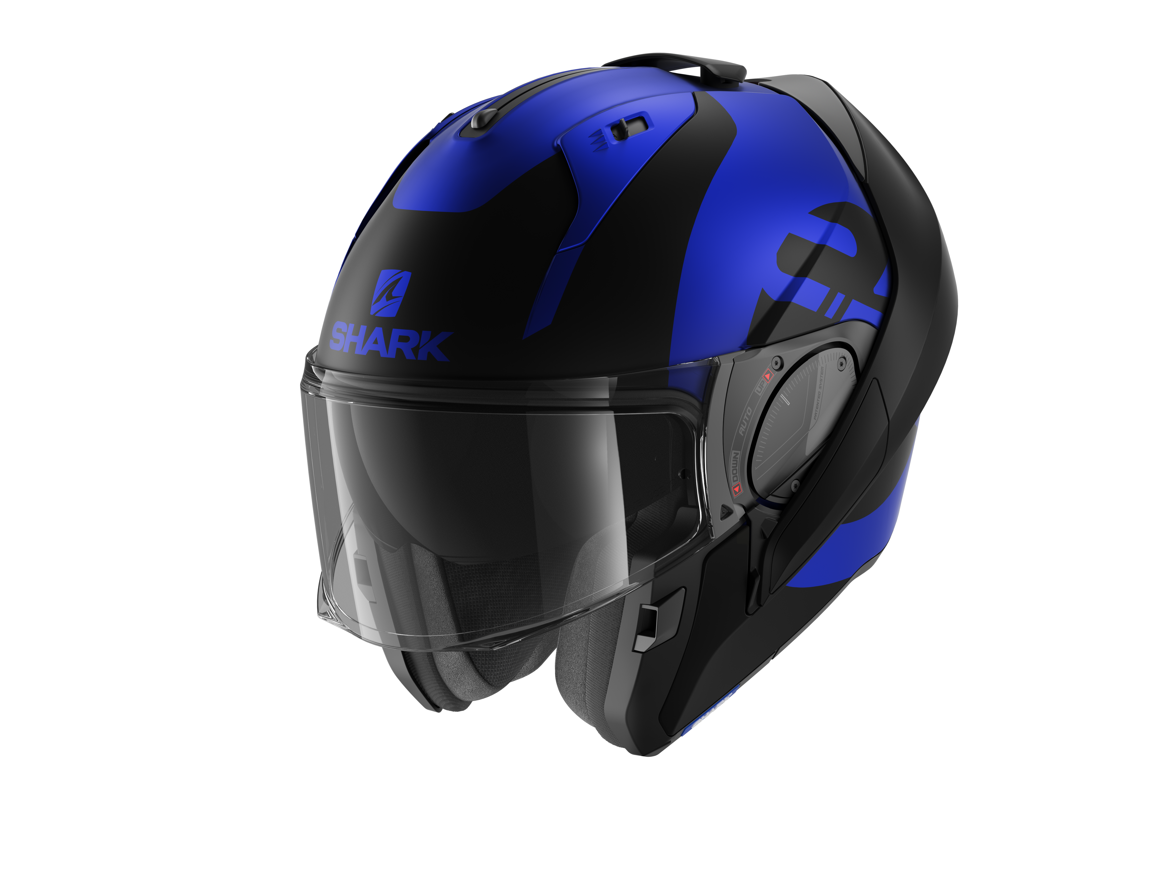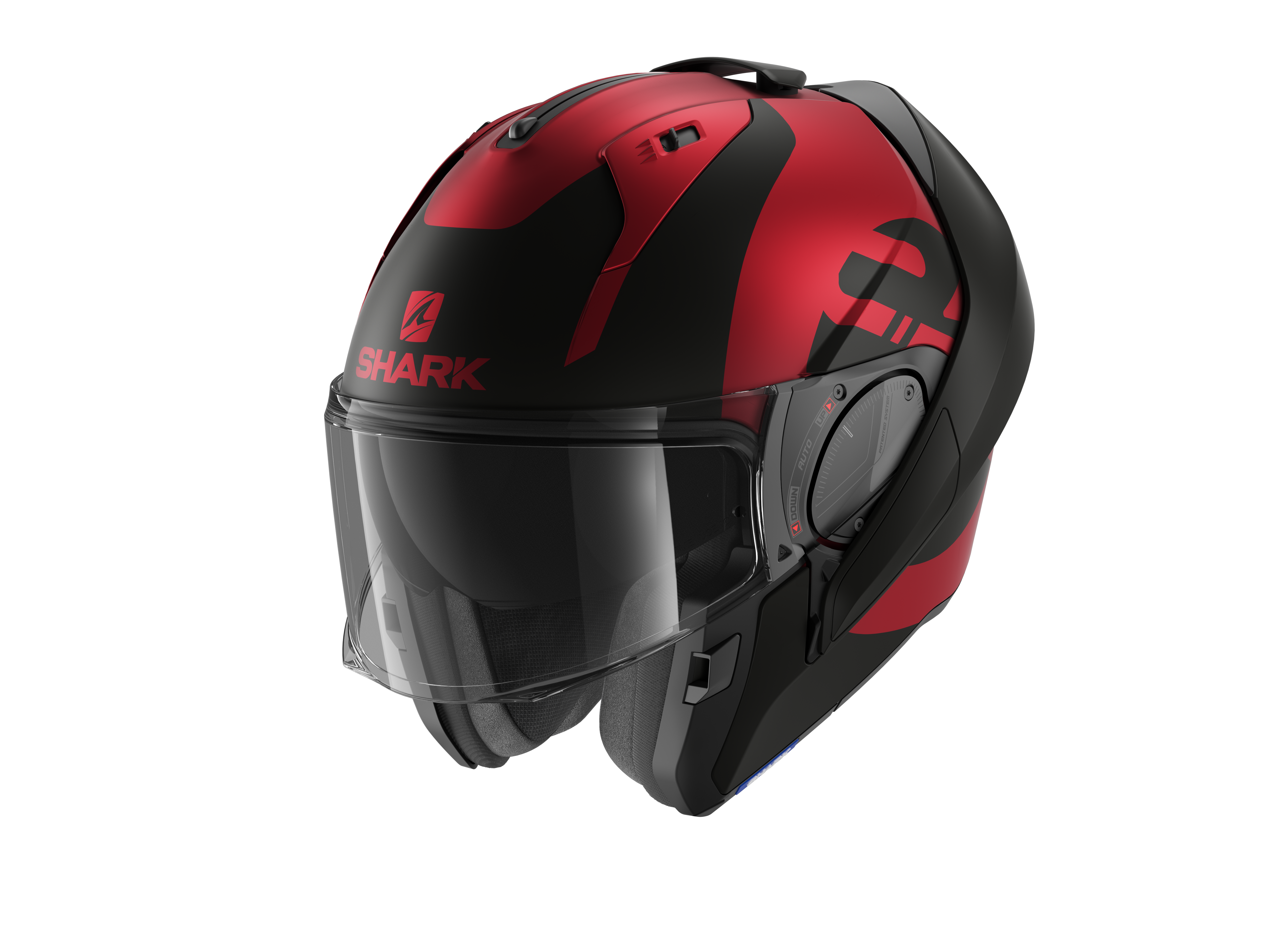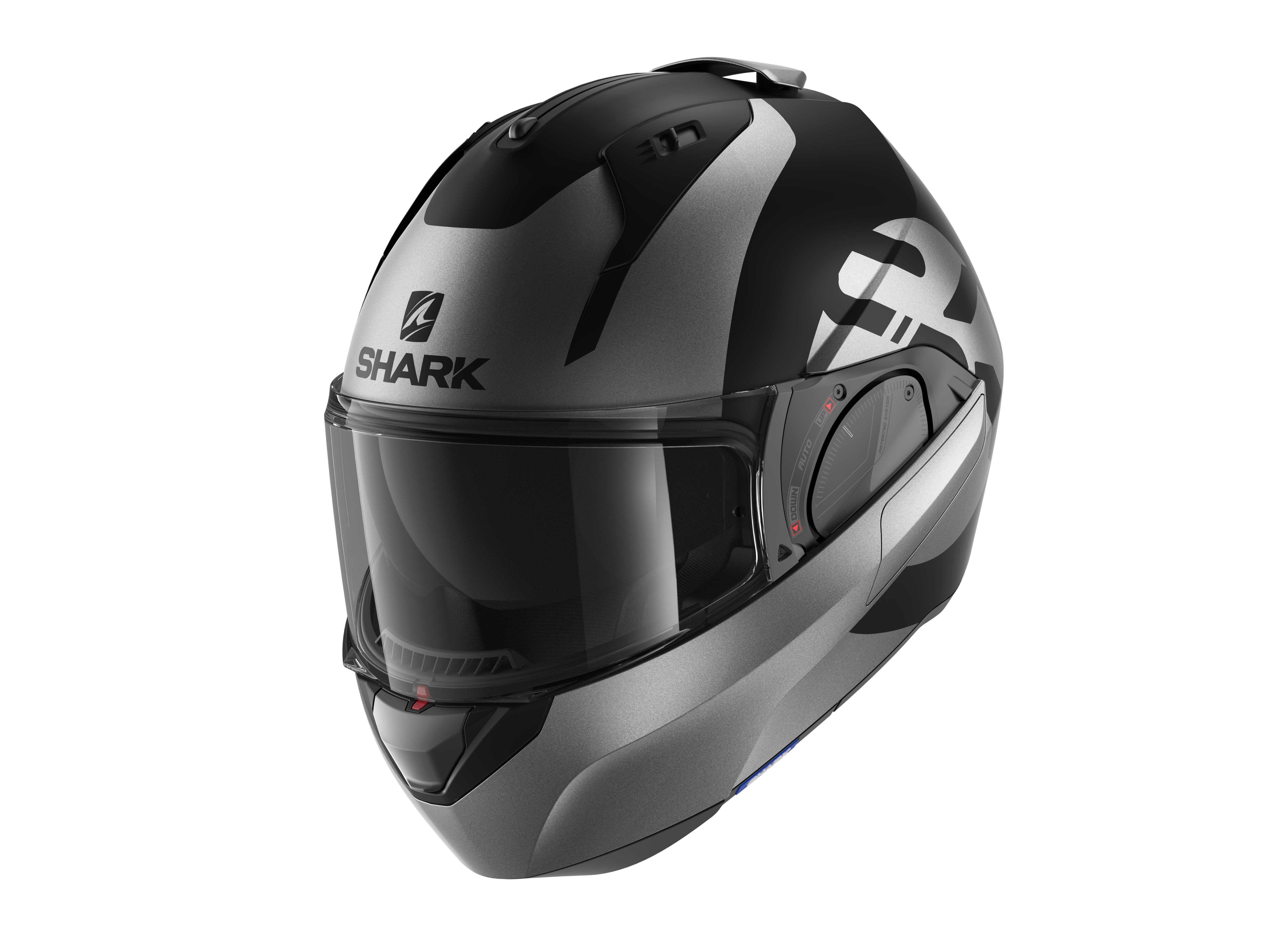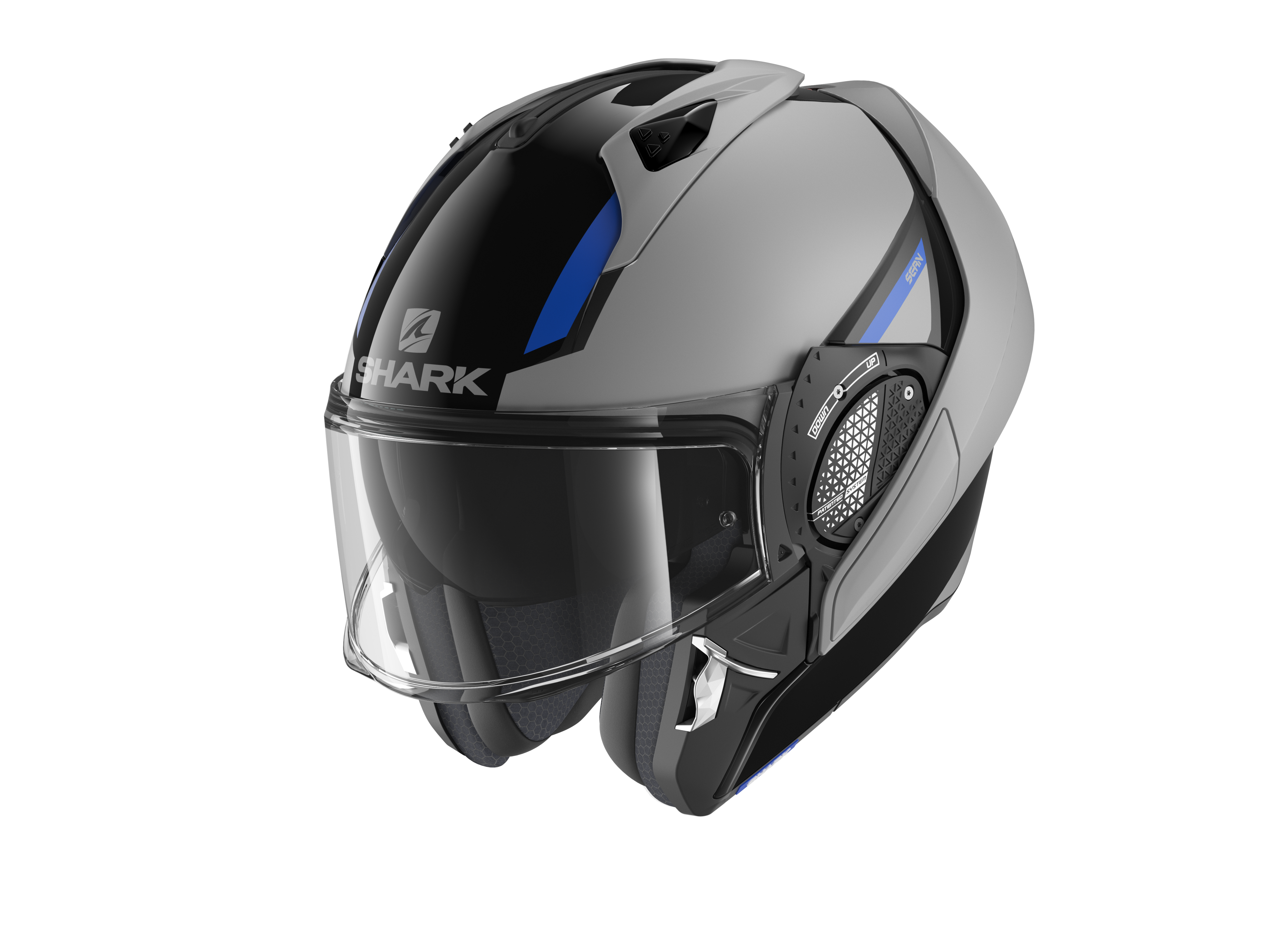 The latest addition to the EVO range, the EVO-GT is the ‘Grand Touring’ model of the dual-homologated modular helmet. Designed to be as comfortable in the jet position as it is in the full-face setting, this premium model boasts the patented SHARK Auto-up/Auto-down system which automatically raises the visor when moving the chin guard, and the SAFE LOCK system guarantees the chin guard stays locked, even on impact. With an anti-scratch treatment, the EVO-GT’s next-generation optical class 1 VZ 250 visor with variable thickness offers premium optical quality with no visual distortion. The Pinlock 120 Max Vision®, the best anti-fog lens on the market, comes in the box as standard. The EVO-GT is also equipped with an internal sun visor with a central slider: a mechanism that can be used with either hand, practical and easy to use.