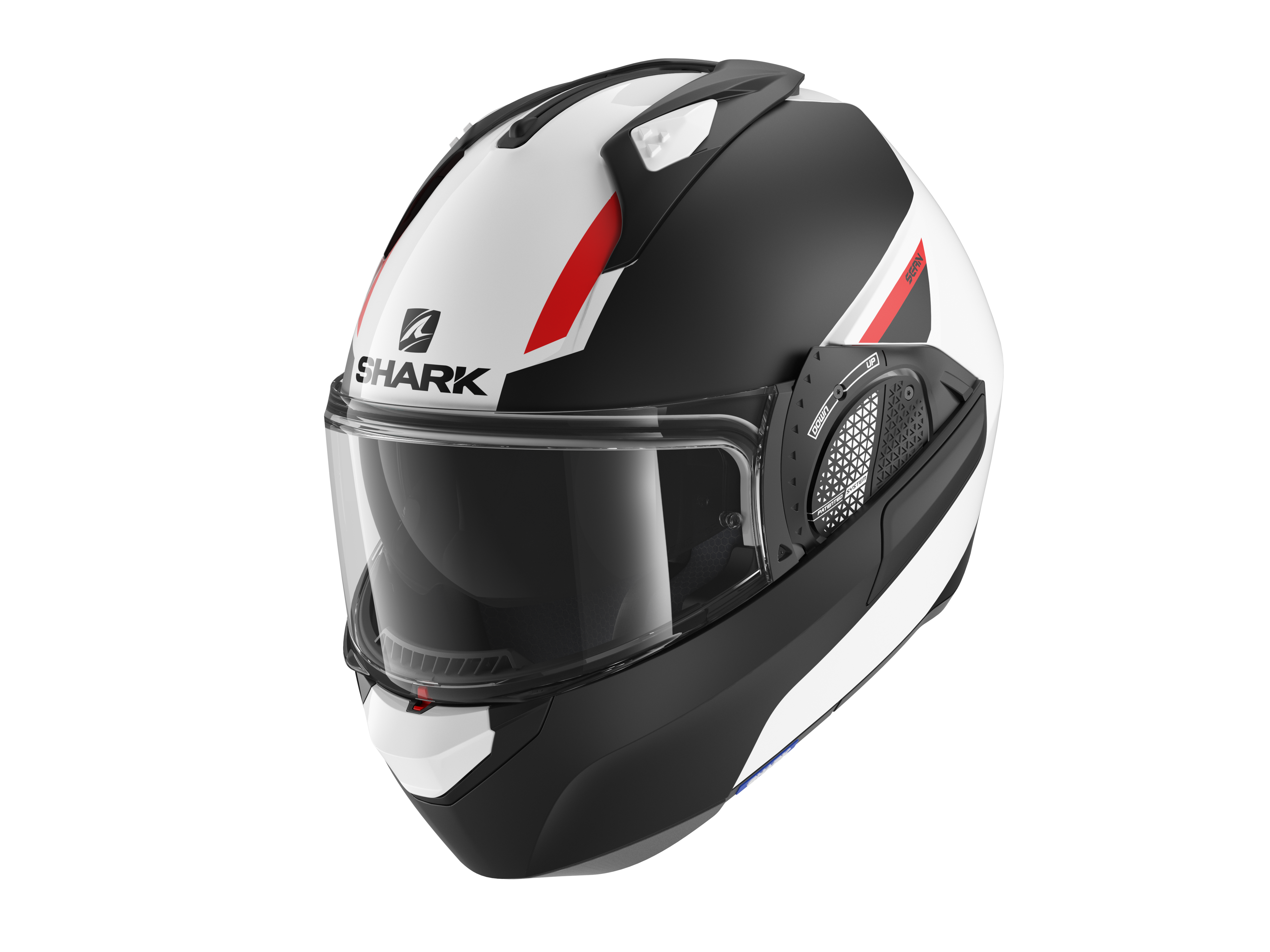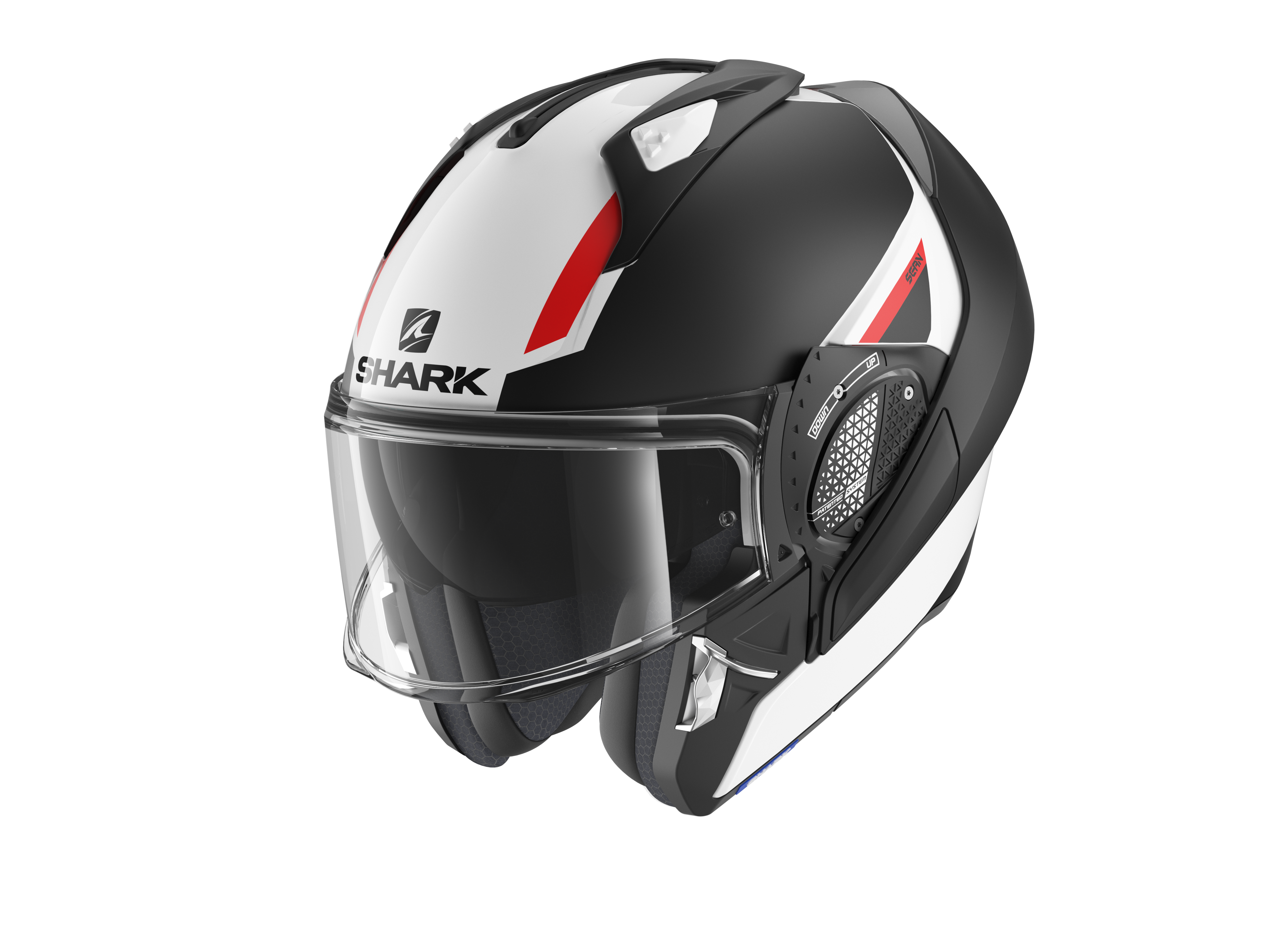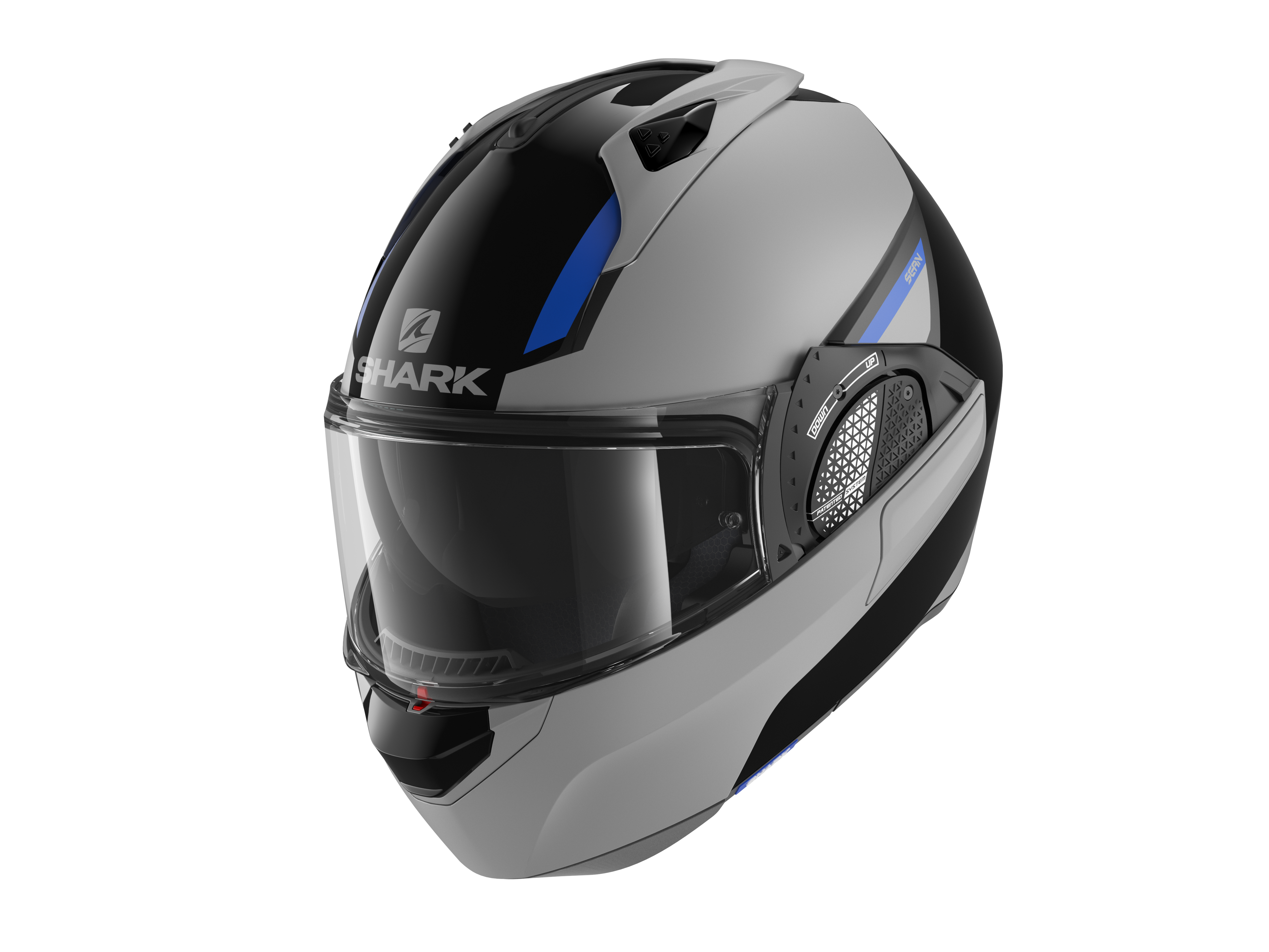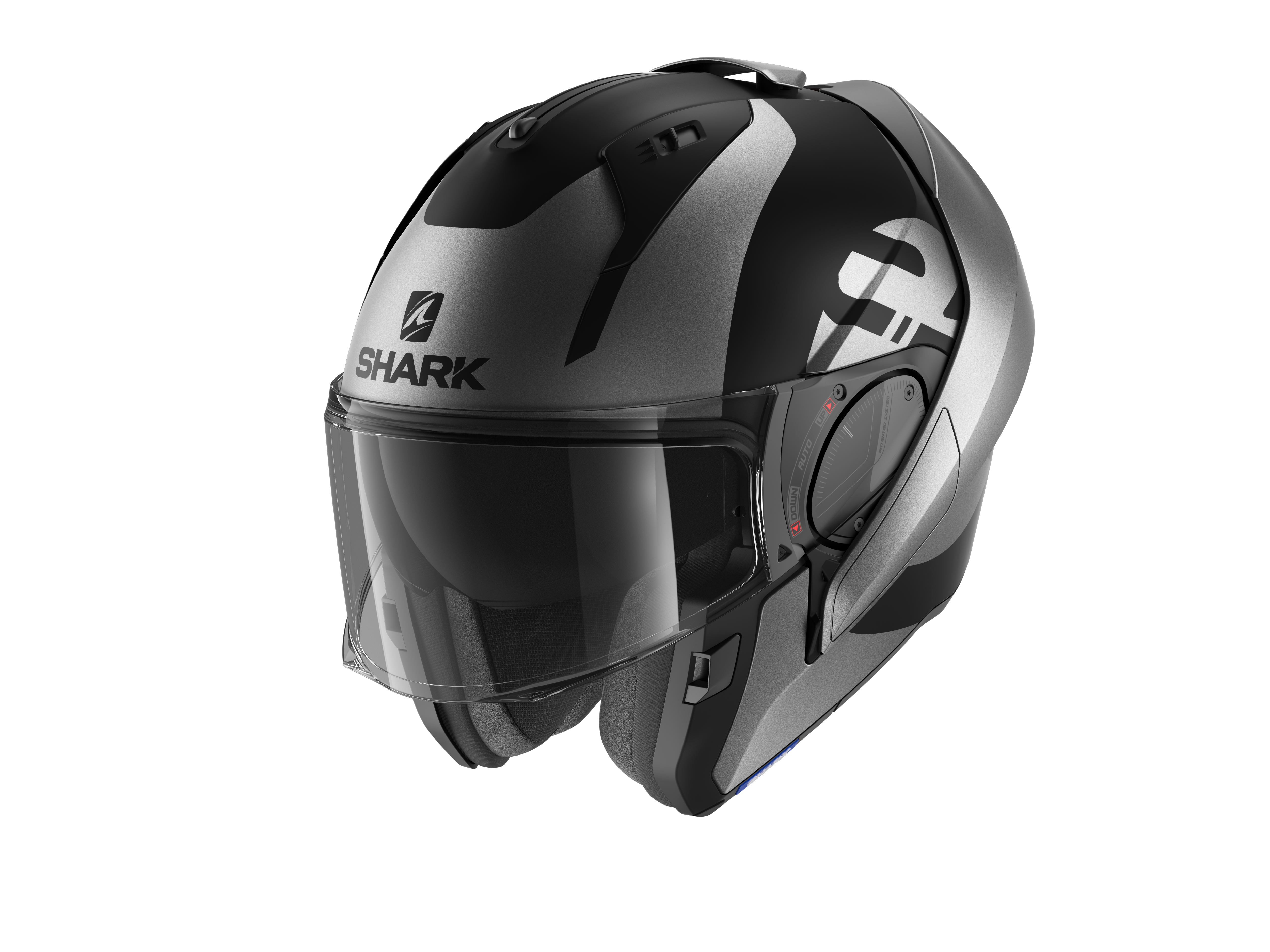 The latest addition to the EVO range, the EVO-GT is the ‘Grand Touring’ model of the dual-homologated modular helmet. Designed to be as comfortable in the jet position as it is in the full-face setting, this premium model boasts the patented SHARK Auto-up/Auto-down system which automatically raises the visor when moving the chin guard, and the SAFE LOCK system guarantees the chin guard stays locked, even on impact. With an anti-scratch treatment, the EVO-GT’s next-generation optical class 1 VZ 250 visor with variable thickness offers premium optical quality with no visual distortion. The Pinlock 120 Max Vision®, the best anti-fog lens on the market, comes in the box as standard. The EVO-GT is also equipped with an internal sun visor with a central slider: a mechanism that can be used with either hand, practical and easy to use.