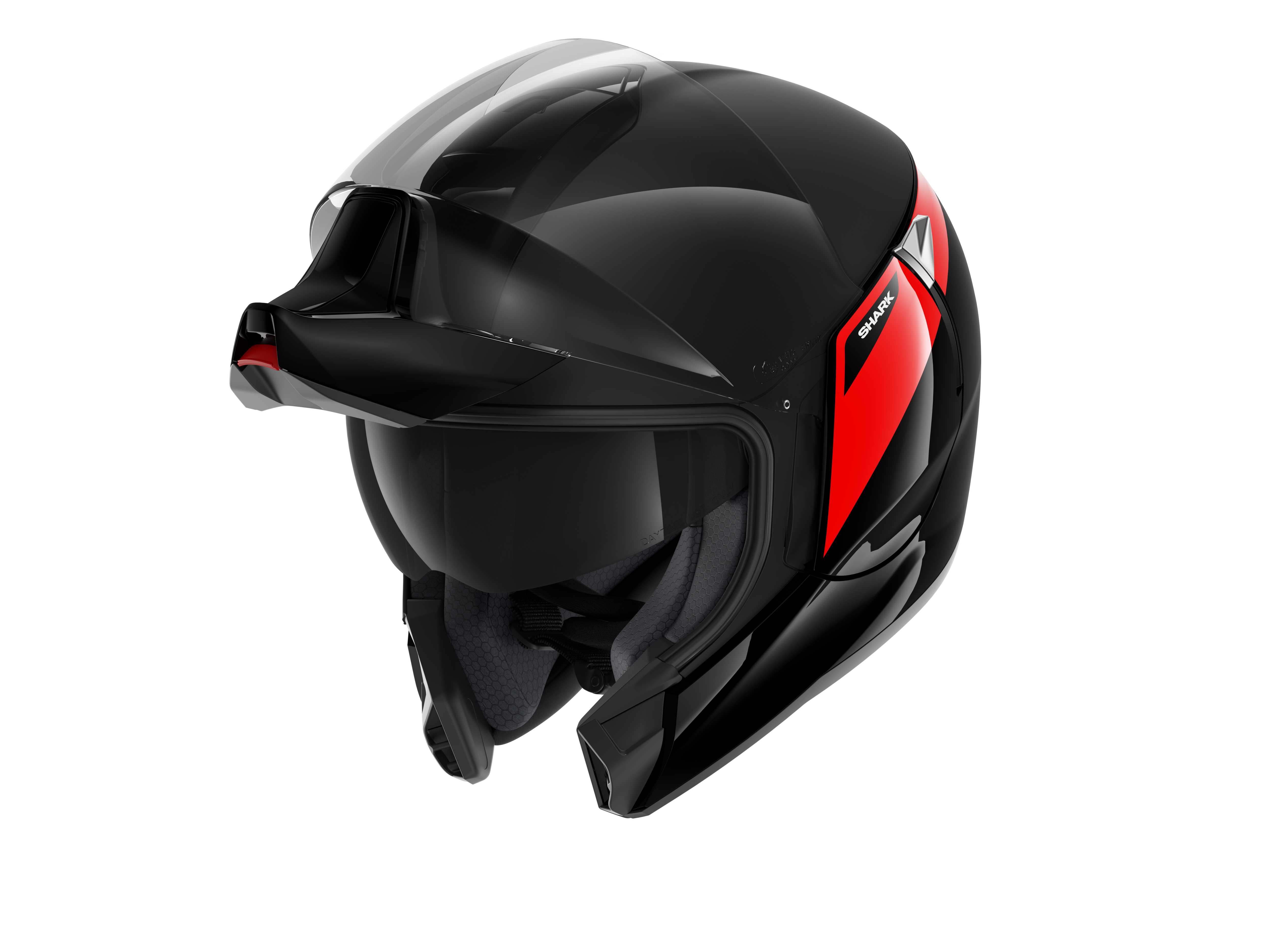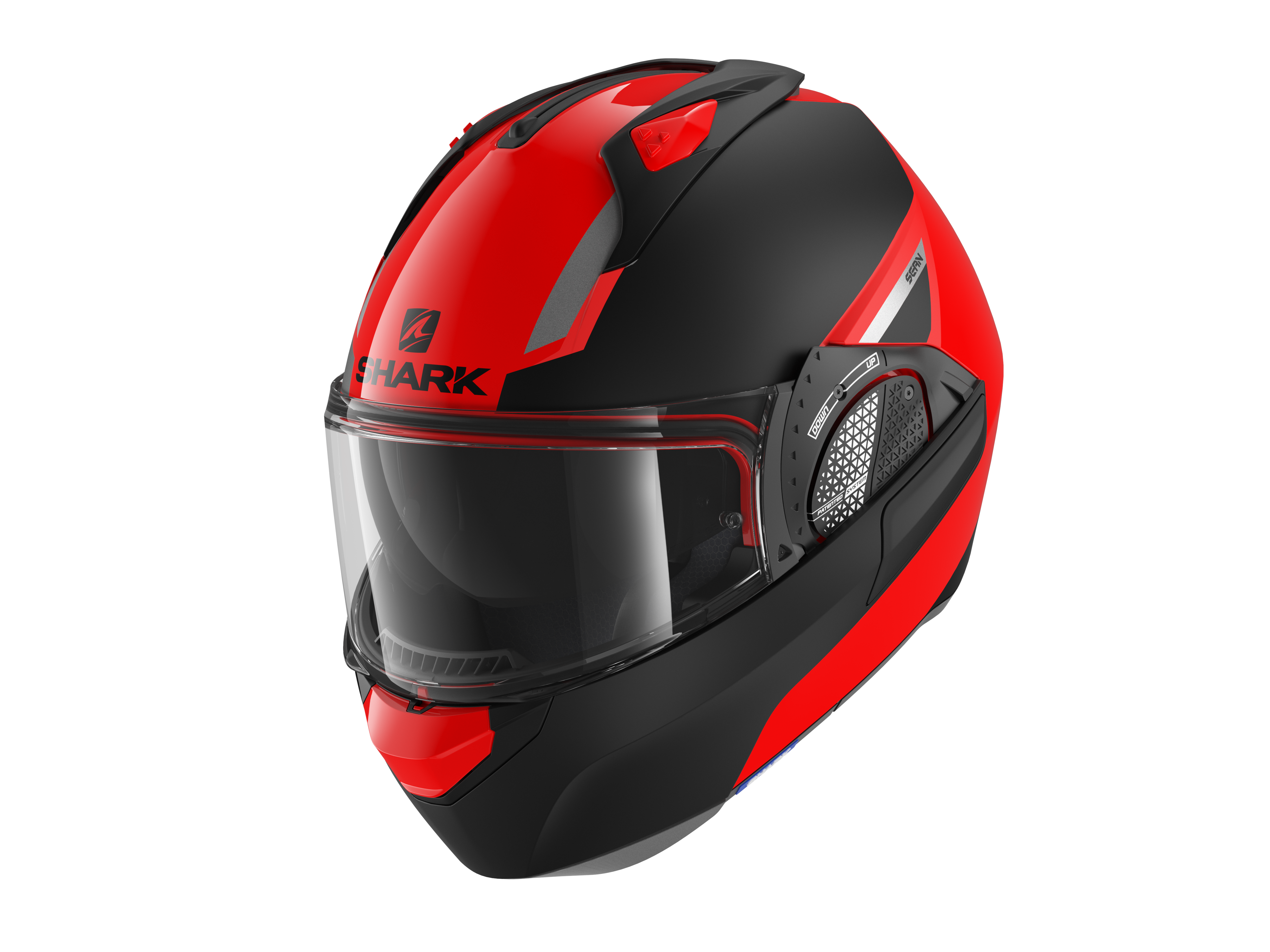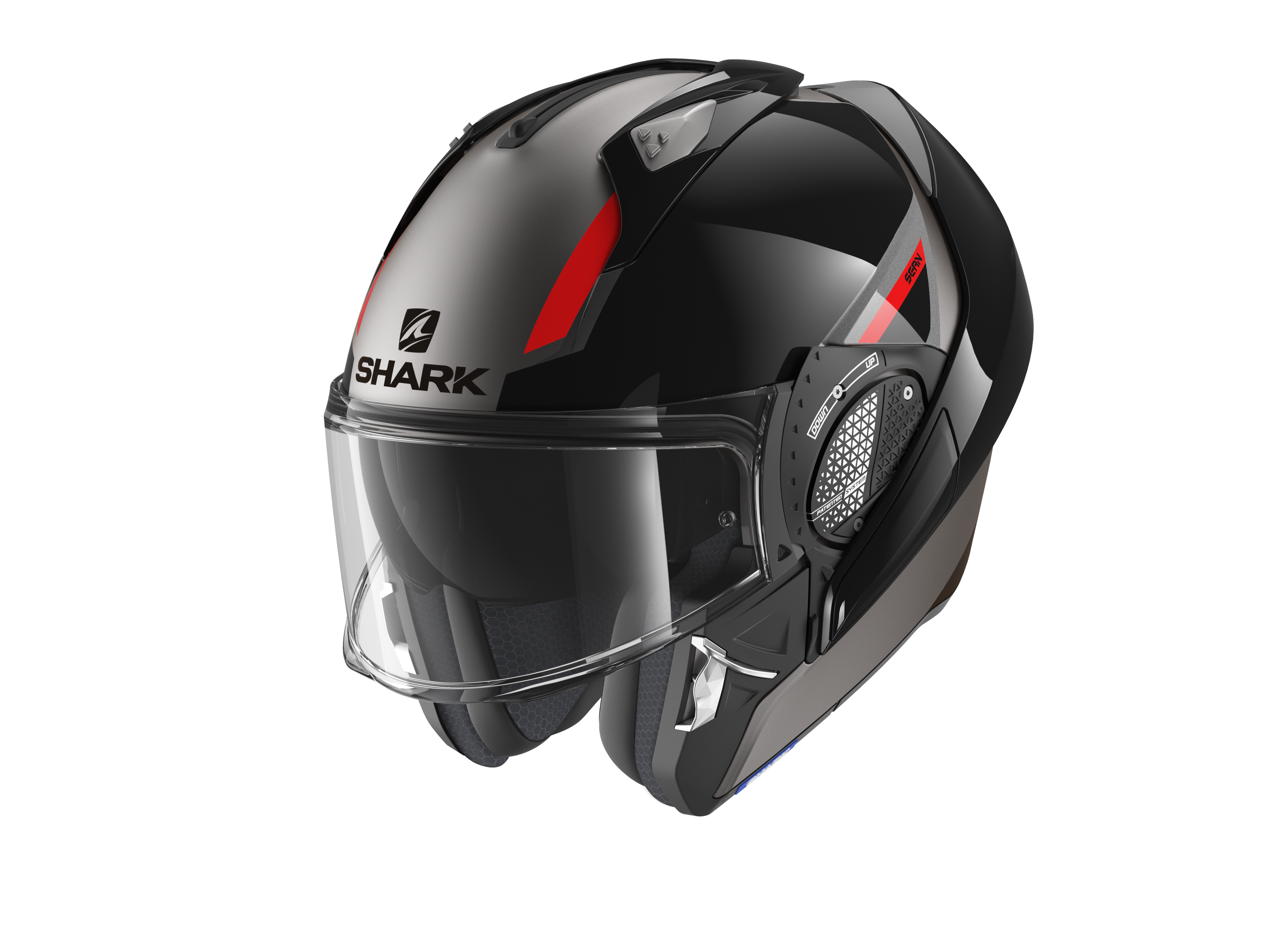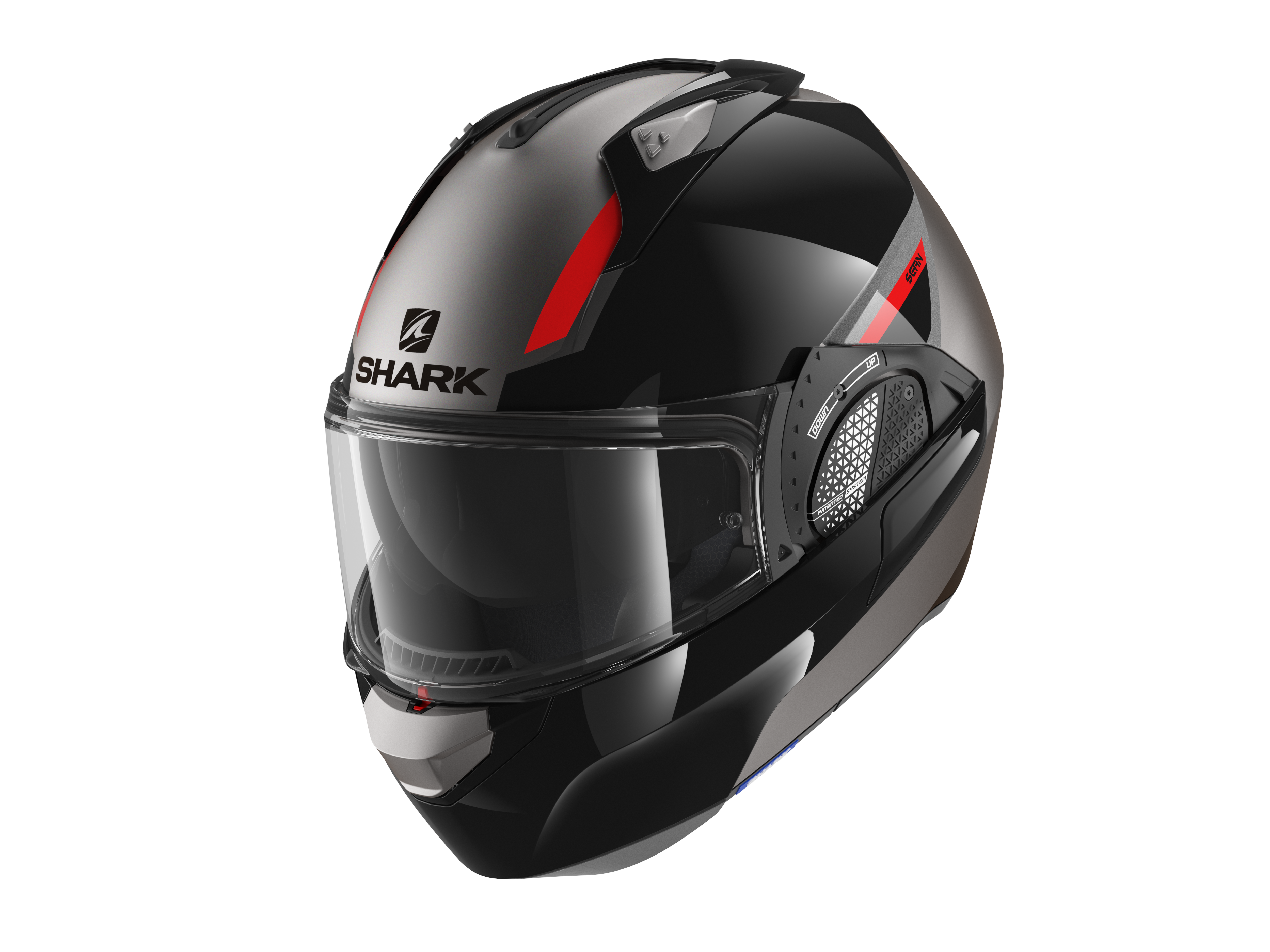 The latest addition to the EVO range, the EVO-GT is the ‘Grand Touring’ model of the dual-homologated modular helmet. Designed to be as comfortable in the jet position as it is in the full-face setting, this premium model boasts the patented SHARK Auto-up/Auto-down system which automatically raises the visor when moving the chin guard, and the SAFE LOCK system guarantees the chin guard stays locked, even on impact. With an anti-scratch treatment, the EVO-GT’s next-generation optical class 1 VZ 250 visor with variable thickness offers premium optical quality with no visual distortion. The Pinlock 120 Max Vision®, the best anti-fog lens on the market, comes in the box as standard. The EVO-GT is also equipped with an internal sun visor with a central slider: a mechanism that can be used with either hand, practical and easy to use.